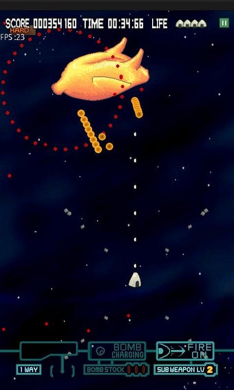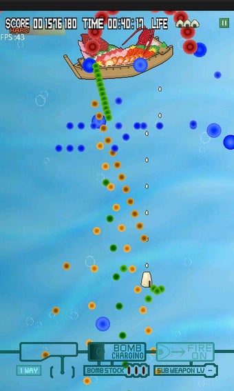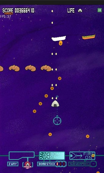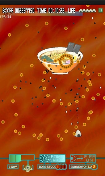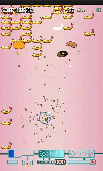 戦闘中はタッチもしくはスライドで上下左右の移動ができ、ダブルタップや「BOMB」ボタンで爆弾を使用できます。右下の「FIRE」ボタンで攻撃のオンオフ切り替えができるので、うまくタイミングを図って目の前のエビフライやシャケを撃破していきましょう。プレイ方法は通常のシューティングゲームと何ら変わりはありません。ただ、敵の弾にぶつかってお米が砕け散るときに改めて「あ、そういえばおにぎりだった」と再認識するのみです。